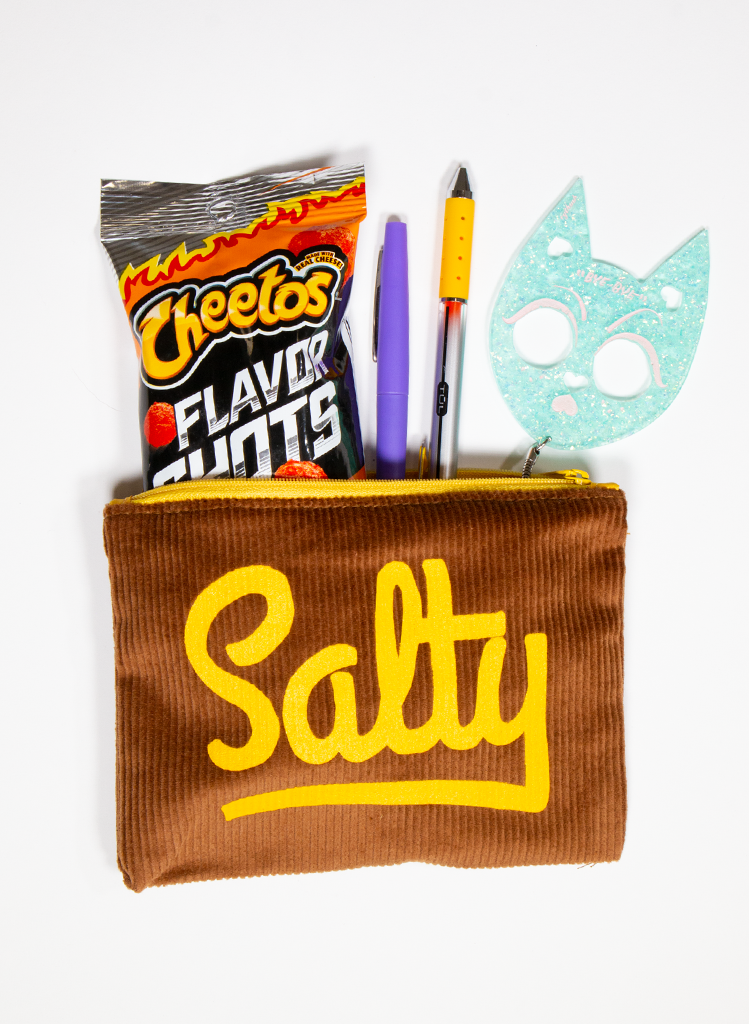 Features: corduroy pouch large enough to hold all of your essentials (7.25x5)